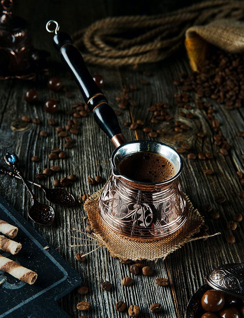Turška kava je umetnost, naša ročno izdelana bakrena džezva za kavo pa je popolno orodje za ustvarjanje pristne izkušnje. Zaradi debele bakrene strukture se kava enakomerno segreje, kar zagotavlja poln okus in aromo, po kateri slovi turška kava.
