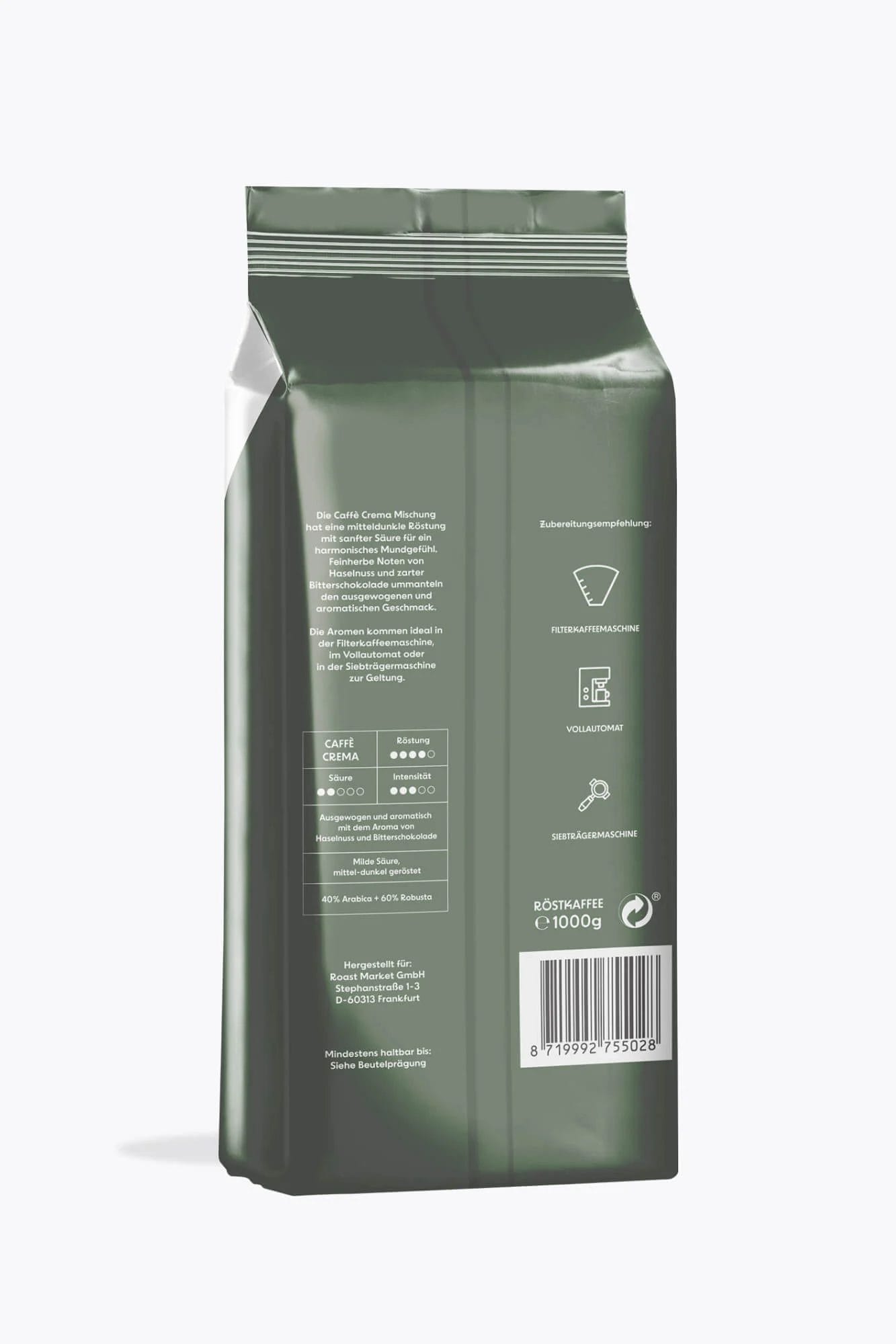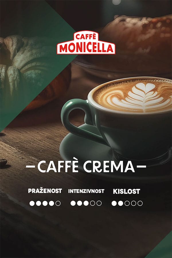 Caffè Monicella Caffè Crema je rahlo močna mešanica iz zrn Arabica in Robusta (40/60 %). Srednje temno praženje (italijansko praženje) zagotavlja intenziven okus z malo kisline ter z notami temne čokolade in praženih mandljev. Zrna prihajajo iz Brazilije, Hondurasa, Etiopije, Ruande, Peruja, Indonezije in Ugande ter so mokro obdelana. Caffè Monicella Caffè Crema je idealna osnova za latte macchiato, espresso in cappuccino, pripravljena v filtrirni kavi, avtomatu ali ročnem aparatu za espresso.