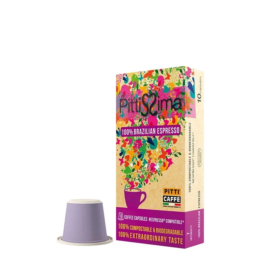Odkrijte bogat in uravnotežen okus brazilske kave v teh kompostabilnih kapsulah Pitti Caffè. Skrbno izbrana zrna zagotavljajo polno aromo in nežne čokoladne note, ki bodo navdušile vaše brbončice. Privoščite si okolju prijazno skodelico espresso užitka z visoko kakovostjo in italijansko tradicijo v vsaki kapsuli.